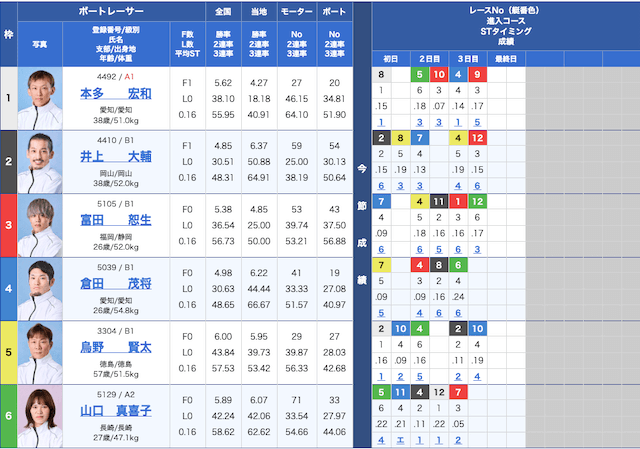 例えば上記の出走表の2号艇の岩永選手は、初日のレースで3号艇からスタートして4着だったということがわかります。